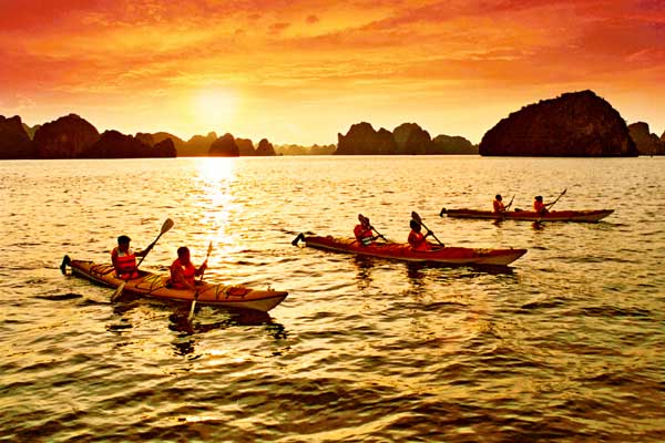 15:00 Quý khách du thuyền đi giữa Hạ Long với hàng ngàn đảo đá sừng sững, Quý khách sẽ có cảm giác như đi vào thế giới động vật trải qua triệu năm hoá đá với Hòn Chó Đá, Lư Hương, Dãy Bình Phong, Hòn Gà Chọi…. tham quan cuộc sống của ngư dân ở làng chài,… Quý khách tự do tham quan, ngắm cảnh hoặc chèo thuyền Kayak (Chi phí khách tự túc).